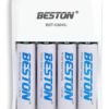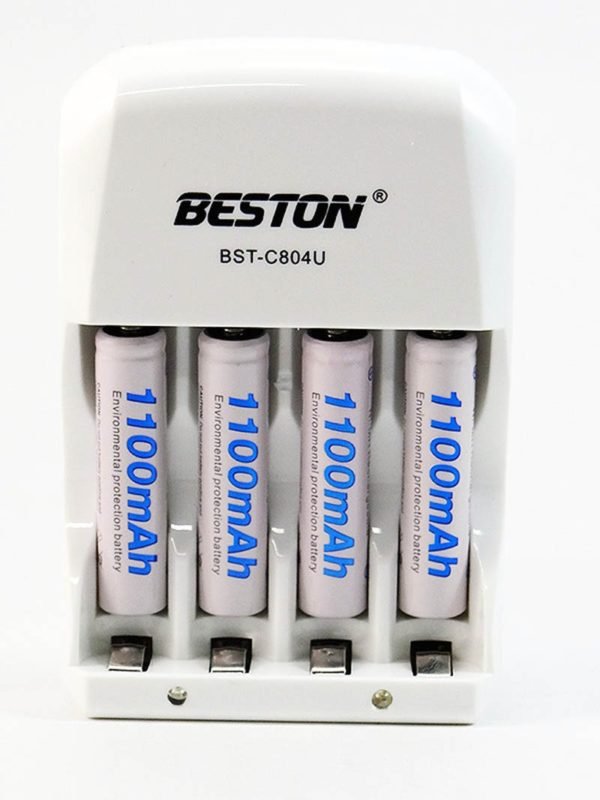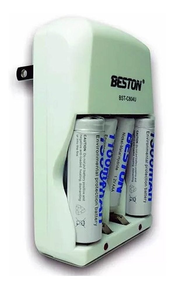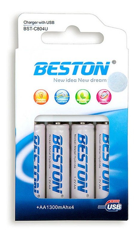 El Cargador de Pilas Batería BESTON BST-C804U carga 4 baterías recargables AA/AAA Ni-MH o Ni-Cd al mismo tiempo. La LED azul alumbrará mientras se carga, y se apagará cuando está totalmente cargada 9.5horas después. Reconoce las baterías no recargables, los cortocircuitos y las baterías defectuosas, mediante su microprocesador; además tiene protección del cortocircuito. Con salida USB no pueden cargarse baterías AA / AAA.
