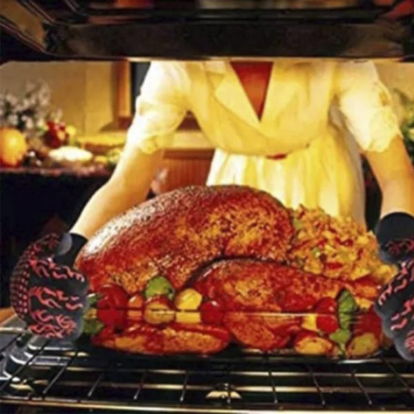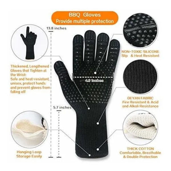 Este Guante es perfecto para proteger tu mano de altas temperaturas en la cocina, el horno, asador, la chimenea, en la reparación de vehículos, soldadura, reparación eléctrica y al manipular otros artículos muy calientes. Tiene su capa exterior hecha de hilo deyan que es resistente al fuego, con recubrimiento de silicona antideslizante; la manga larga evita que tu antebrazo y muñeca se quemen cuando se sostienen en un horno caliente. Por dentro está forrado con fibras de algodón supersuave para respirar, el guante de hornear tiene una buena circulación de aire.