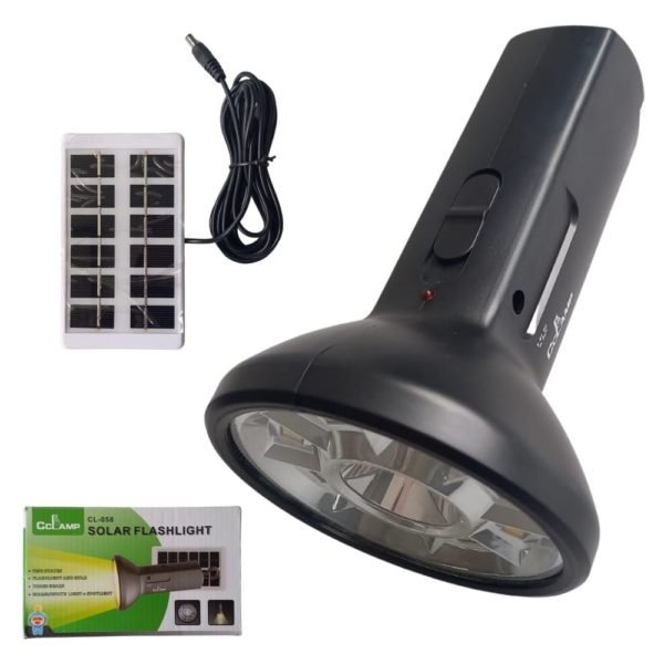 Poderosa Linterna CCLAMP CL-058 con concentración de luz LED. Cuenta con 3 modos de iluminación, luz blanca focal, luz alta blanca y luz cálida alta. Su batería es recargable y trae su panel solar para cargarla. Ideal para su seguridad en carretera, caminatas, deportes como tiro al blanco, pesca, paseos, camping, e infinidad de usos.