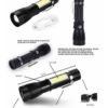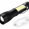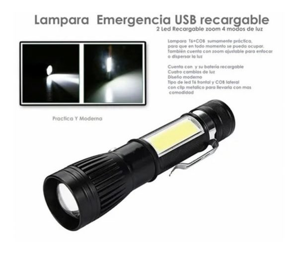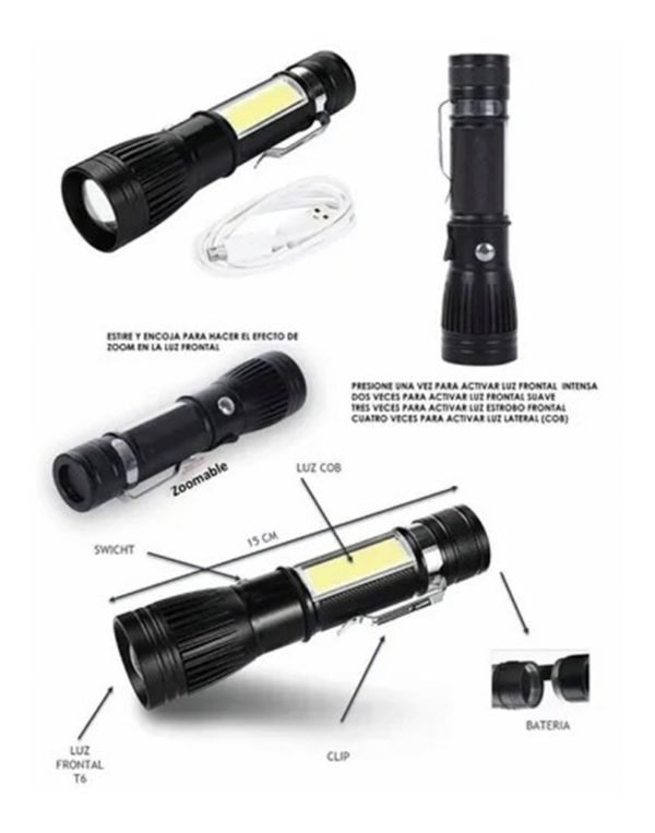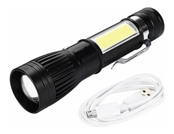 Poderosa Linterna Recargable Iluminación Luz Led Zoom W545 con concentración de luz led y zoom. 2 linternas en 1: frontal y lateral. También cuenta con zoom ajustable para enfocar o dispersar la luz. Recargable carga con cable USB (incluido). Puede ser usado para su seguridad en carretera, lampara auxiliar del auto, deportes como tiro al blanco, pesca, paseos, camping, caminatas, e infinidad de usos.