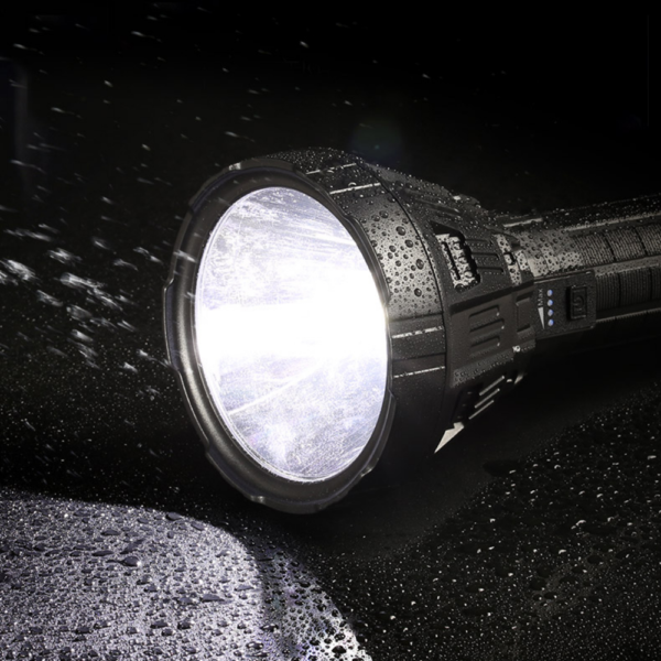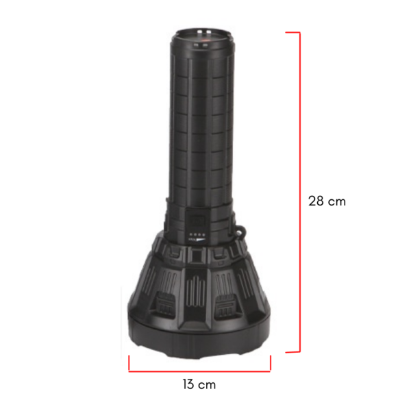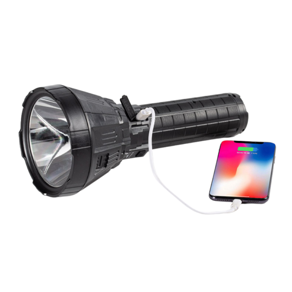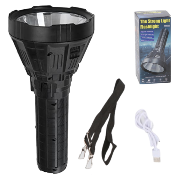 Poderosa Linterna Recargable W5102, concentración de luz led blanca Trae batería interna recargable, y sirve como banco de carga para celular y otros dispositivos. 5 modos de iluminación (Alta, media, baja, strober, SOS. Ideal para su seguridad en carretera, lampara auxiliar del auto, deportes como tiro al blanco, pesca, paseos, camping, caminatas, e infinidad de usos.