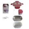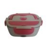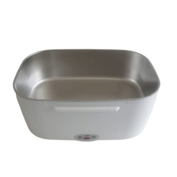 Taza eléctrica para llevar comida y calentarla en cualquier lugar sin el uso de un microondas. Tiene una bandeja de acero desmontable y un contenedor pequeño con tapa para fruta o ensalada. En la tapa tiene integrado un compartimiento para cubiertos, incluye una cuchara. Alimentación por cable desde un tomacorriente. Dispositivo para control de temperatura interno e indicador de encendido.