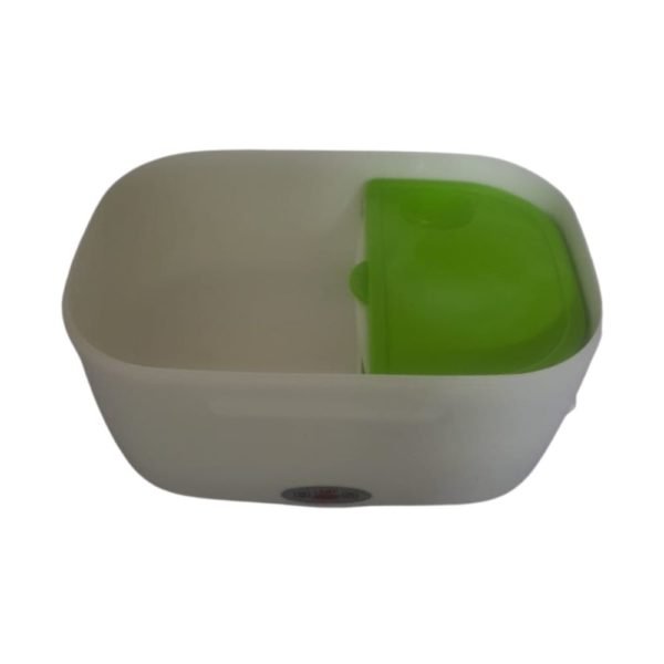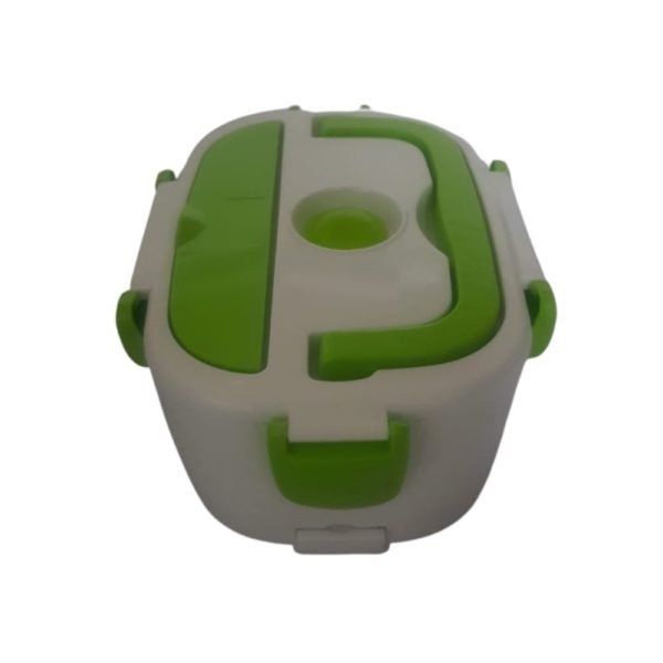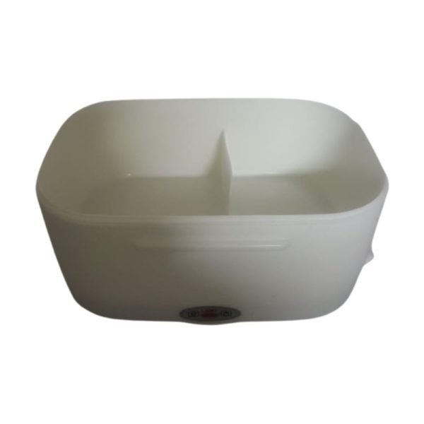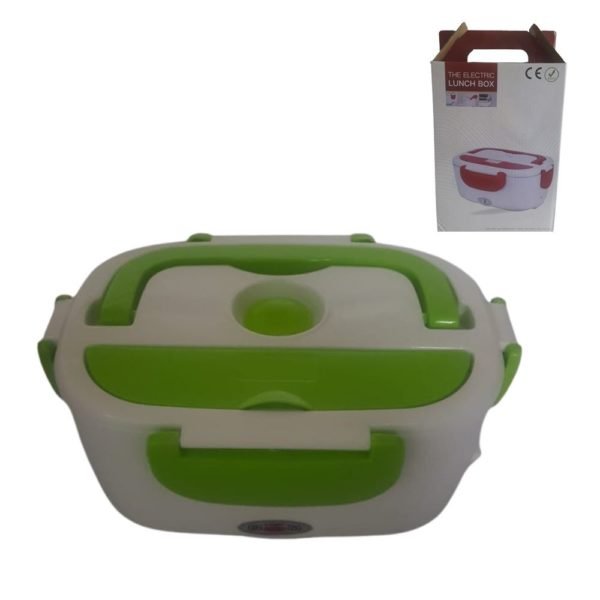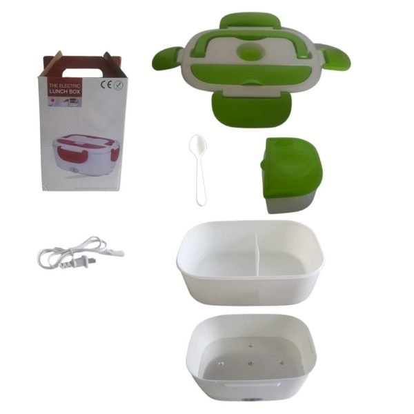 Taza eléctrica para llevar comida y calentarla en cualquier lugar sin el uso de un microondas. Tiene una bandeja plastica desmontable y un contenedor pequeño con tapa para fruta o ensalada. En la tapa tiene integrado un compartimiento para cubiertos, incluye una cuchara. Alimentación por cable desde un tomacorriente. Dispositivo para control de temperatura interno e indicador de encendido.