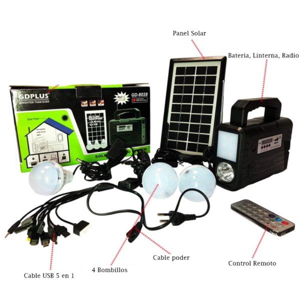 <<<<< PANEL SOLAR 4 BOMBILLOS BATERÍA LINTERNA RADIO MP3 CARGADOR GD PLUS GD-8028 >>>>>